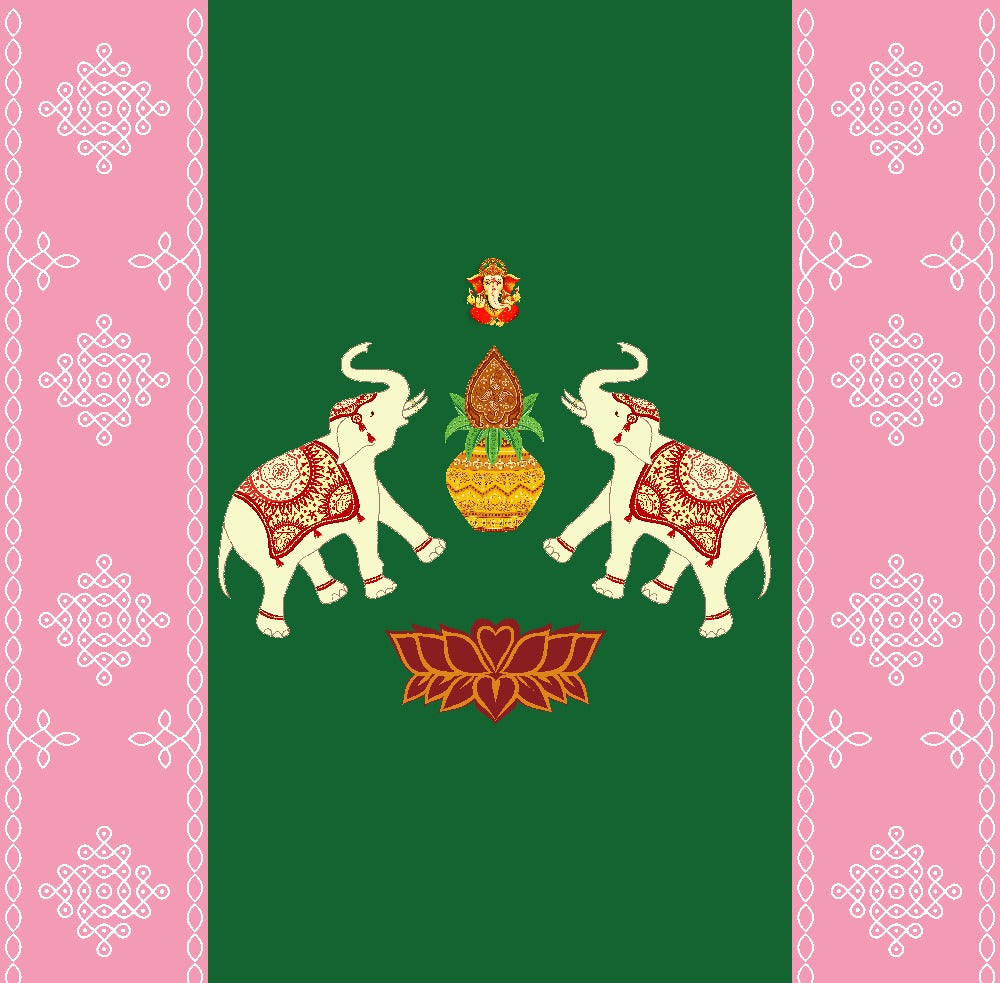 A vibrant blend of green and baby pink with the Elephants graciously welcoming Ganesha in this backdrop.