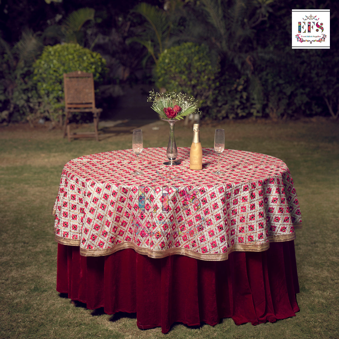 Indian traditional mirror work maroon color table cloth. Let our customize table cover add the beauty to your memorable function.