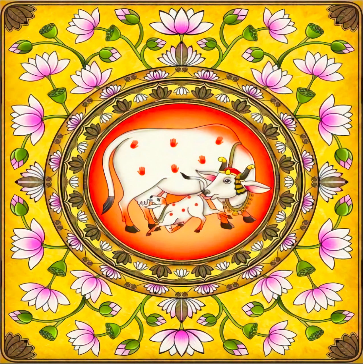Pichwai cow backdrop in a floral surrounding