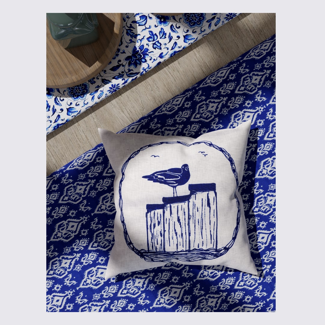 Inspired by the modern day sightings and nostalgic memories of birds chirping atop our window sills, this white and blue cushion is a contemporary take on the classic. Keep your cool interiors a visual treat with this indigo cushion.