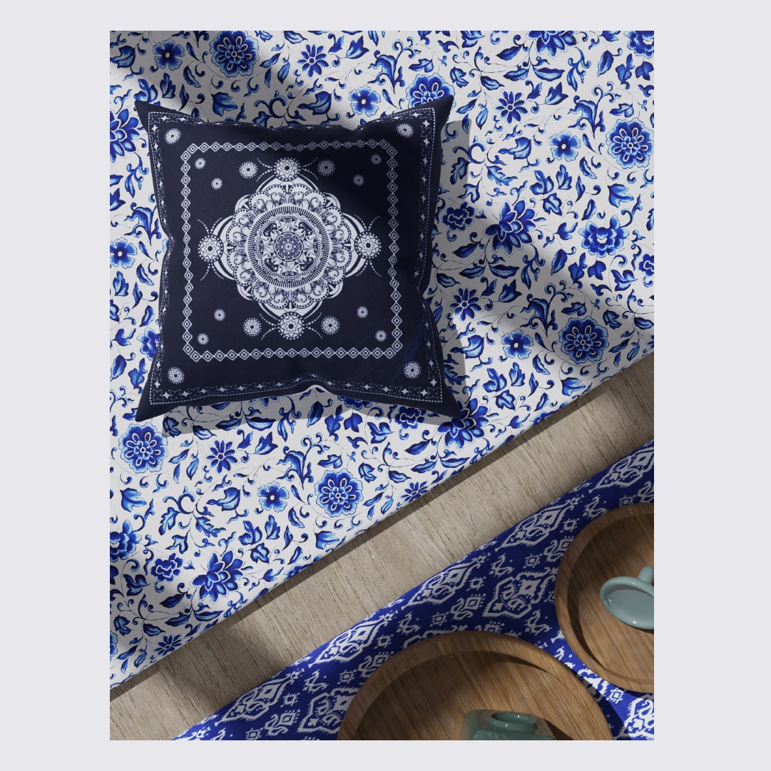 A deep indigo cushion cover with white intricate printed details makes it a classic one to keep and accessories your space with. Mix and match cushions by textures from our wide range they reflect light differently adding depth to your decor.