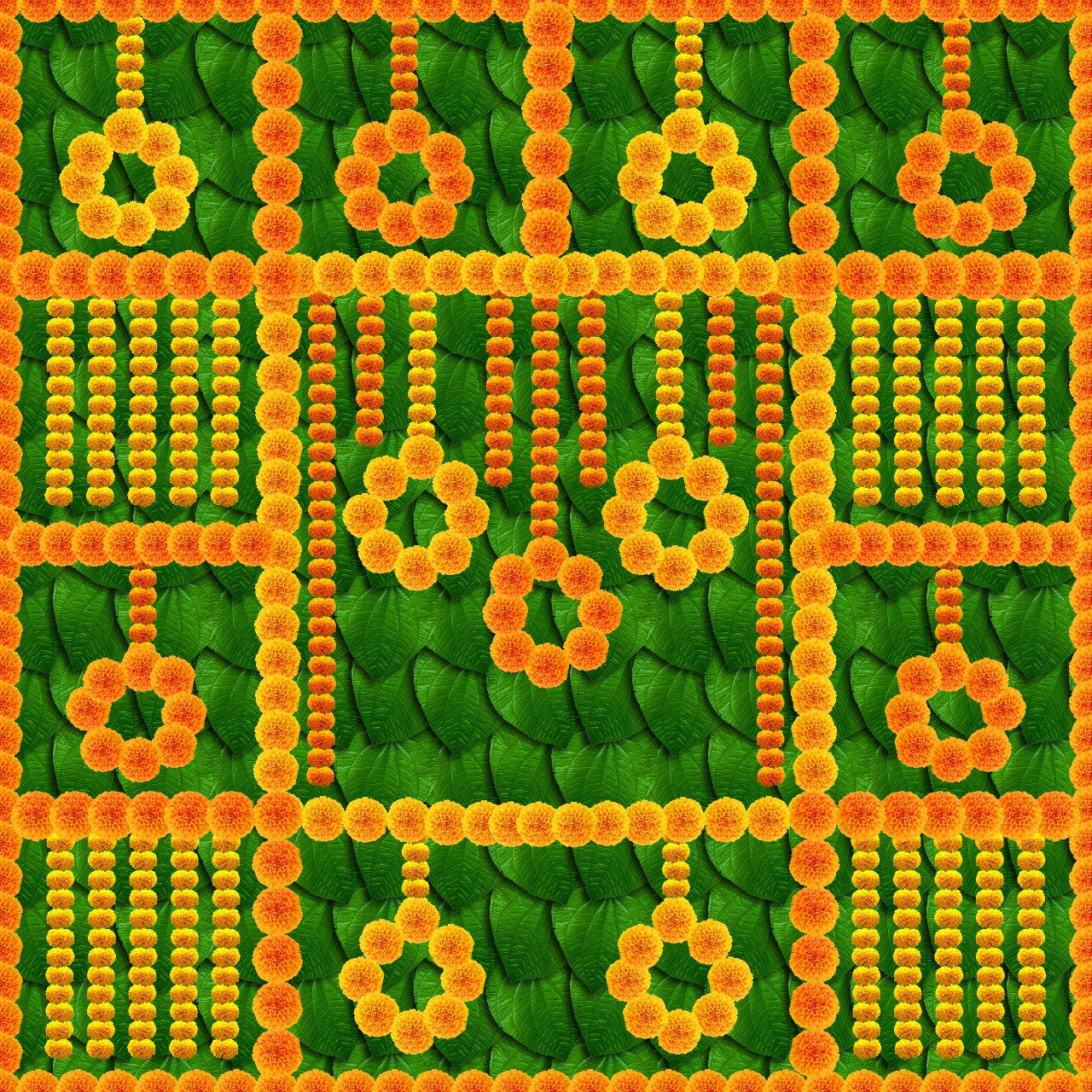 South Indian Backdrop: Texture of Banana leaf with marigold flower patterns