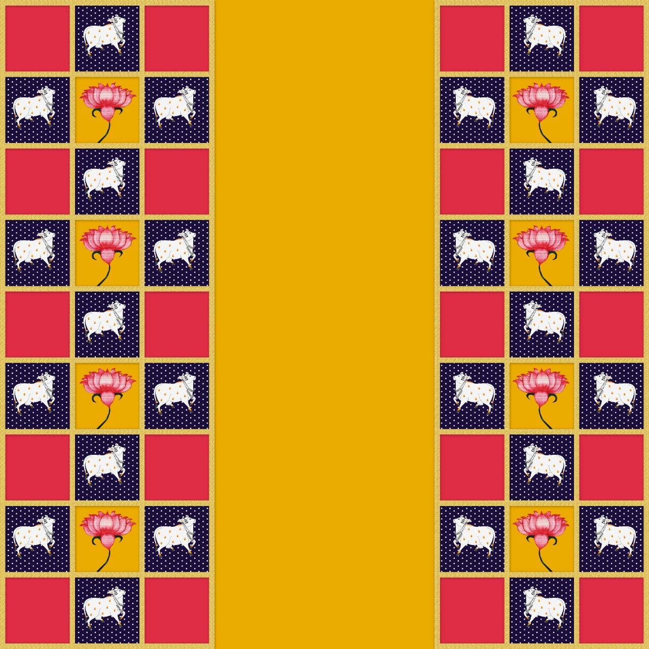 A fairly plain background using the colours pink, blue, and yellow. With cow and lotus motifs on tiny boxes. This backdrop is ideal for a sangeet or other Indian-themed event.