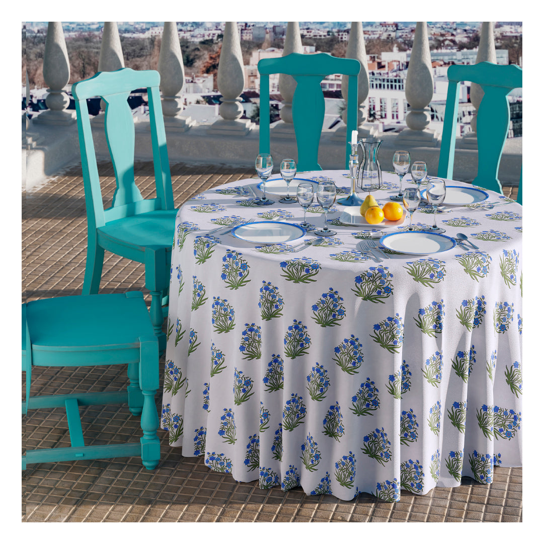 A tablecloth in a yard blue floral print