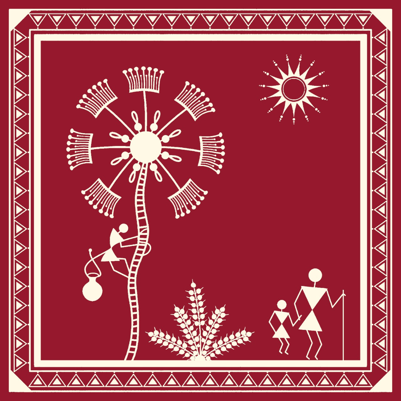 A red backdrop with a print of a Warli painting showcasing a village scene which can be used as part of a decoration in your house or workplace and will look incredibly classy.